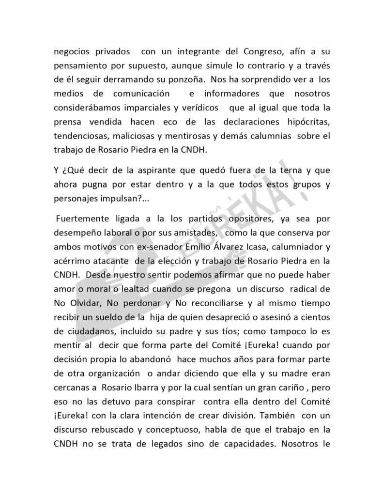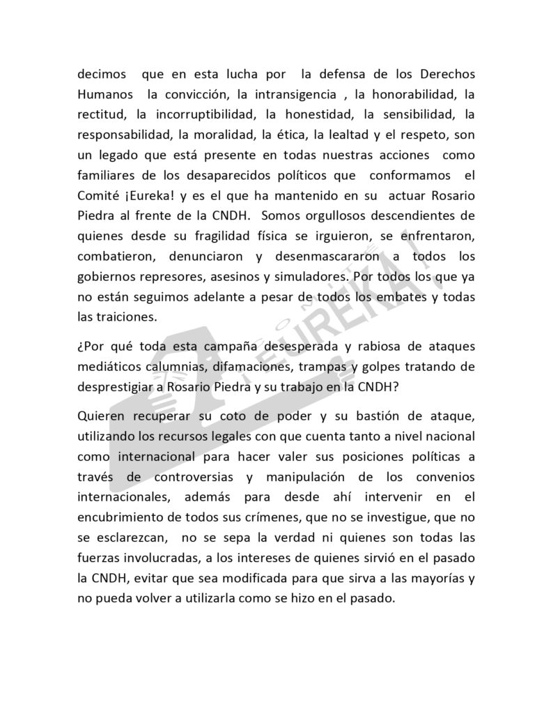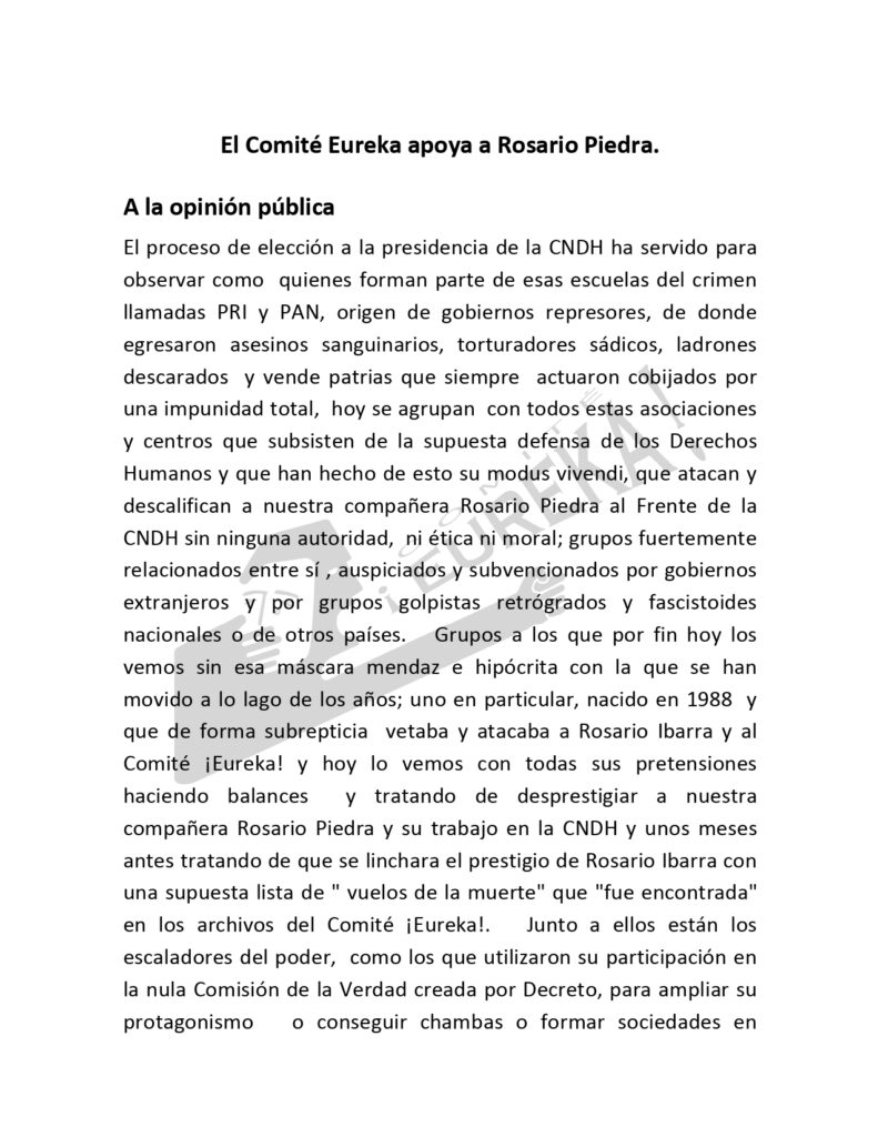Comunicado del Comité ¡EUREKA! El Comité ¡EUREKA! apoya a Rosario Piedra en la elección para presidir la CNDH.
