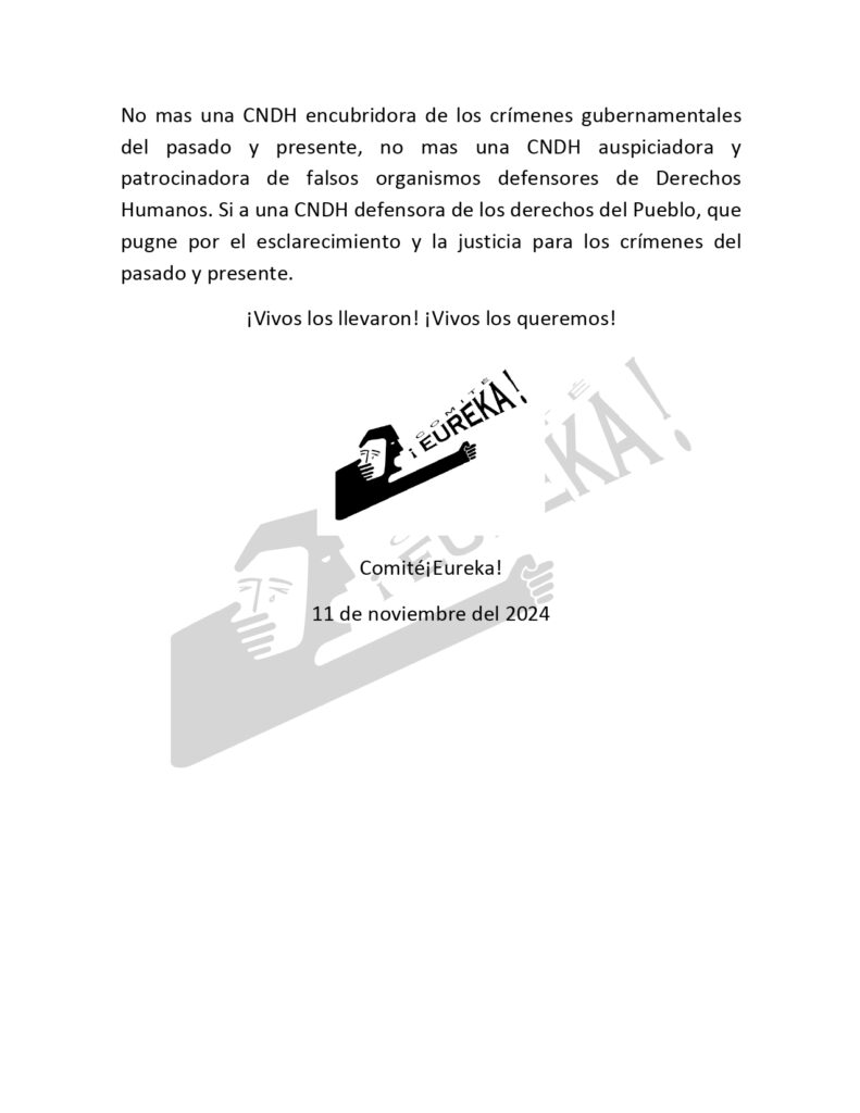 Comunicado del Comité ¡EUREKA! marzo 19, 2026 No hay comentarios Comunicado del Comité ¡EUREKA!, ante la demolición del complejo policial de Tlacoaque reconocido como sitio de memoria el 2 de octubre del 2022. Leer más »